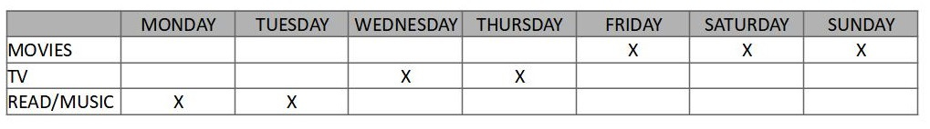 I believe that consuming too much of this content is not healthy. It's great to have so many movies and old TV shows available to enjoy, but the temptation to mass consume can push out too much of the rest of life. For that reason, I decided to schedule my consumption to make time for healthier pursuits and limit my intake.